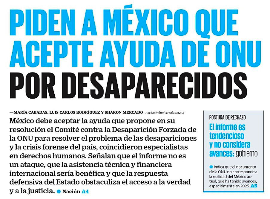 En México, la desaparición de personas se ha consolidado como una crisis estructural que organismos internacionales, incluida la Organización de las Naciones Unidas, consideran un posible crimen de lesa humanidad por su carácter sistemático y generalizado. El Comité de las Naciones Unidas contra la Desaparición Forzada ha identificado “indicios fundados” de que estas prácticas han ocurrido y continúan ocurriendo como parte de ataques contra la población civil, por lo que solicitó al Secretario General llevar el caso ante la Asamblea General para impulsar medidas de apoyo al Estado mexicano. Aunque no halló evidencia de una política federal para cometer desapariciones, sí documentó casos con participación, apoyo o aquiescencia de funcionarios públicos, en un contexto donde las autoridades se encuentran rebasadas por la magnitud de la crisis. La existencia de miles de fosas clandestinas, decenas de miles de restos sin identificar y la falta de avances sustanciales reflejan la gravedad del problema, que requiere reformas estructurales, cooperación internacional y mecanismos eficaces para garantizar verdad, justicia, búsqueda y protección a las familias.